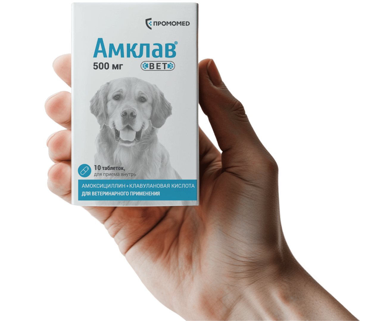 Антибактериальный препарат Амклав®Вет в дозировке 500 мг, содержит амоксициллин 400 мг и клавулановую кислоту 100 мг. Препарат применяют для лечения инфекционных заболеваний собак и кошек бактериальной этиологии, включая: кожные заболевания (в том числе глубокую и поверхностную пиодермию), инфекции мочевыводящих путей, респираторные инфекции бактериальной этиологии (при вовлечении в процесс как верхних, так и нижних дыхательных путей), энтериты бактериальной этиологии, а также инфекции бактериальной этиологии, возбудители которых чувствительны к амоксициллину.